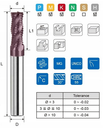Powłoka UNICO zapewnia doskonałą odporność na ścieranie i zmniejsza siły tarcia i adhezji Przeznaczony do materiałów o twardości od 30 do 55 HRC, stal stopowa, żeliwo, stal Zalecany do obróbki zgrubnej z szybkim usuwaniem naddatku Zapewnia króki wiór dzięki ostrzu z owalnym rozdzielaczem Konstrukcja rozdzielaczy wzmacnia krawędź skrawającą.