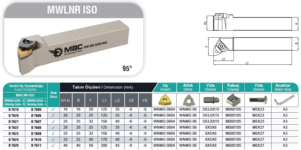 Parametry techniczne produktu Nóż tokarski MBC MWLNL 2020 K08 WNMG 0804..