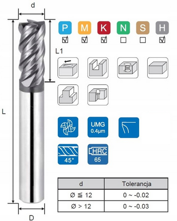 Parametry techniczne produktu Frez VHM KNS D8x8x20x60x4F 65HRC ACO VHM