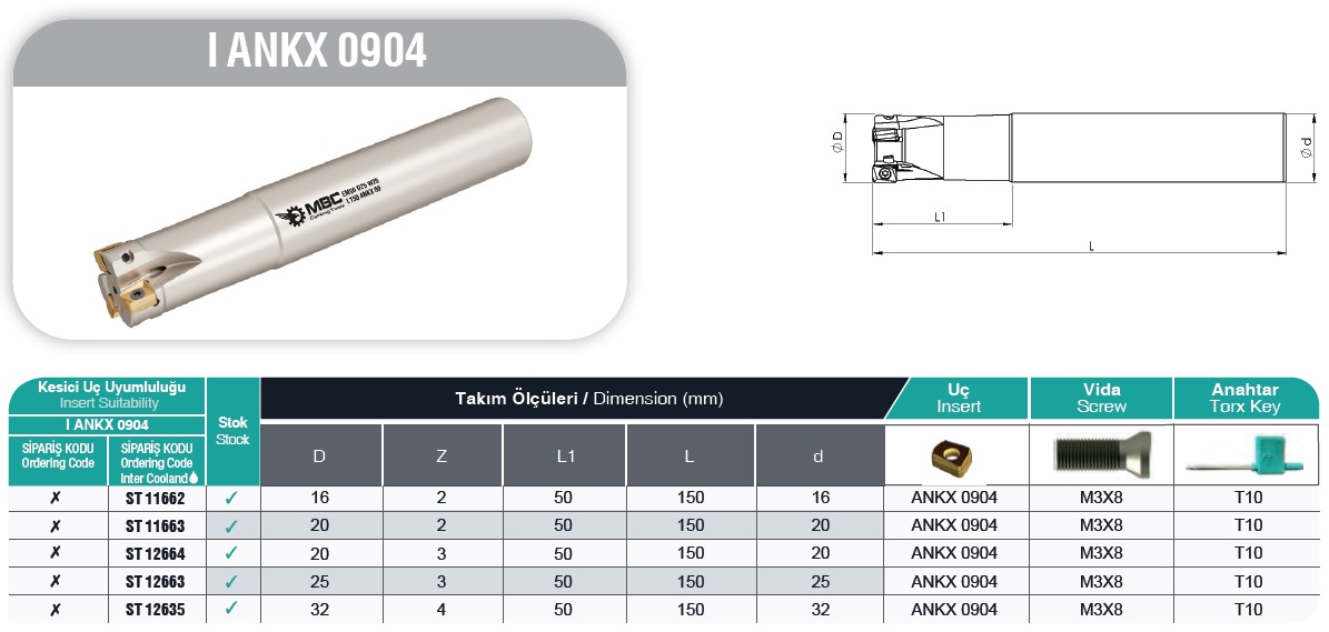 Parametry techniczne produktu Frez składany MBC EM90 D20 W20 Z3 L150 H ANKX 0904