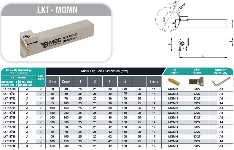 Opis produktu Nóż do rowkowania MBC LKT K-R 2525 3C 65-105 MGMN 300