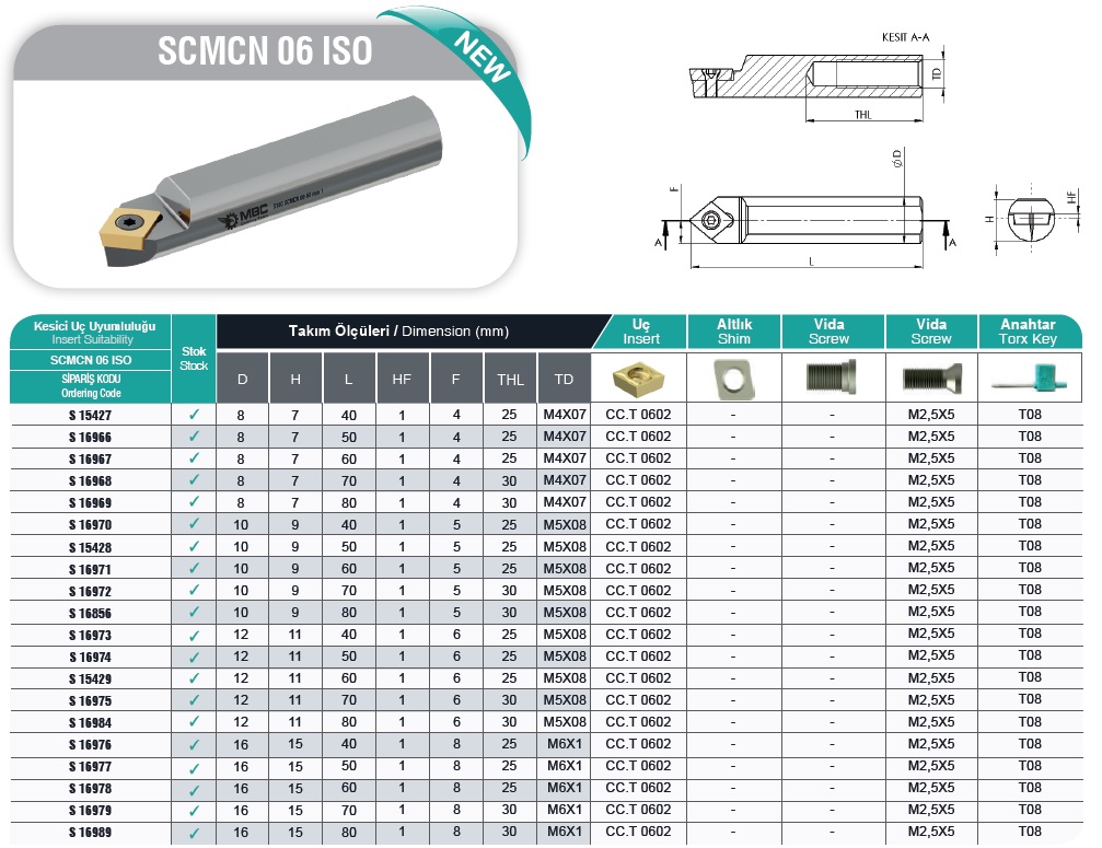 Parametry techniczne produktu Nóż tokarski MBC S10F SCMCN 06 M8 - L60