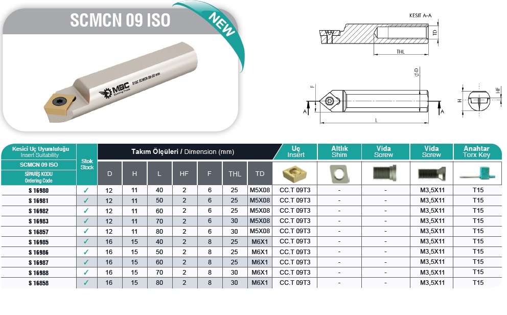 Parametry techniczne produktu Nóż wytaczak MBC S16F SCMCN 09 L60 CCMT 09T3.. gwint M6 wytaczarka